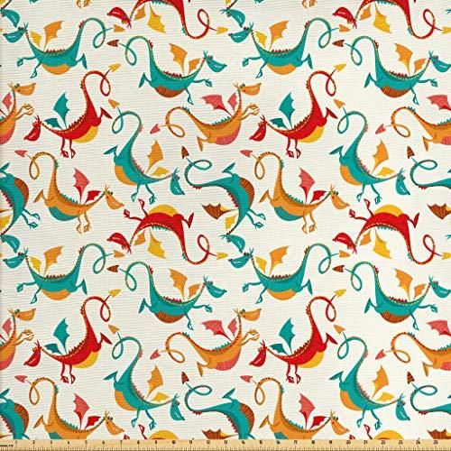 Lunarable Dragon Fabric by The Yard マルチカラー フライングスマイルドラゴン イラスト 漫画スタイル 面白い恐竜 装飾生地