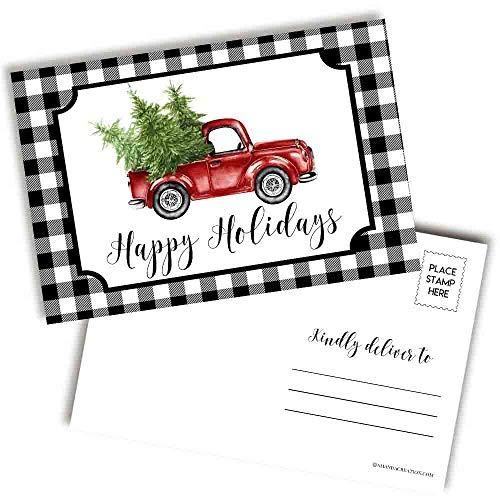 AmandaCreation ブラック格子柄 ピックアップトラック付き ハッピーホリデー 空白ポストカード 友人や家族に送る 4インチx6インチ フィルインノー