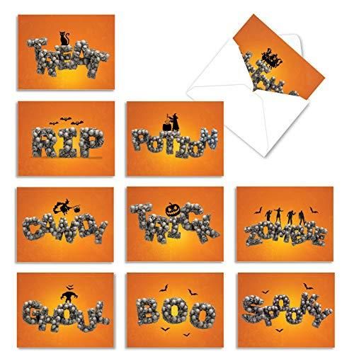 AM6123HWG-B1x10 不気味な言葉 ハロウィーン用ノートカード詰め合わせ。文字が書かれた文字がボーンの形に書かれており、封筒付き。