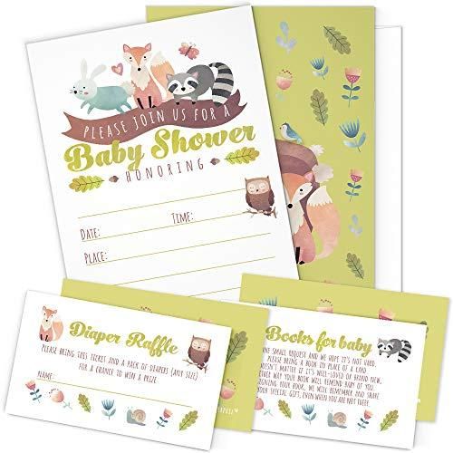 A Set of 25 Woodland Animals Baby Shower Invitations Diaper Raffle Tickets and B