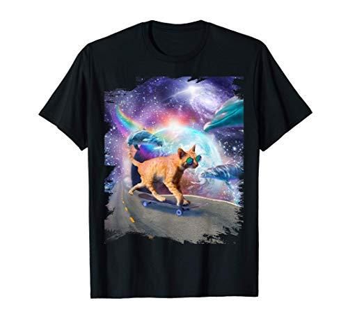 Cat With Sunglasses On Skateboard In Rainbow Space T-Shirt