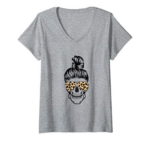 Womens Skull Leopard Print Sunglasses Mom Bun Girl Gift Halloween V-Neck T-Shirt