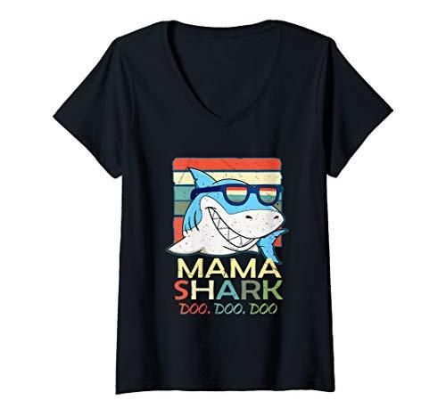 Womens Funny Mama Shark White Shark Mom Sunglasses Predatory Fish V-Neck T-Shirt