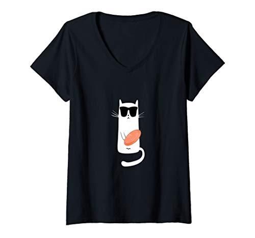 Womens Funny Cat Wearing Sunglasses Playing Disc Golf V-Neck T-Shirt