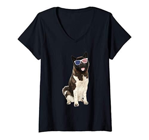 Womens American Akita Wearing Sunglasses 4th Of July Dog V-Neck T-Shirt