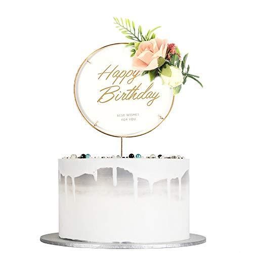 Auteby ハッピーバースデーケーキトッパー - アクリルと花のカップケーキトッパー 様々な誕生日パーティーケーキデコレーション用
