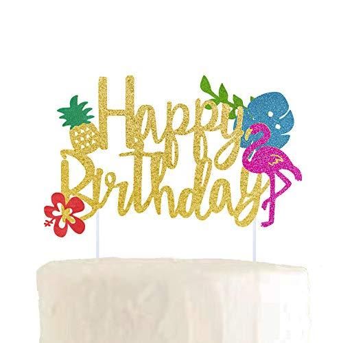 フラミンゴ ハッピーバースデー ケーキトッパー ハワイアン ルアウ トロピカルテーマ 男の子 女の子 誕生日パーティー 両面 バルク グリッター