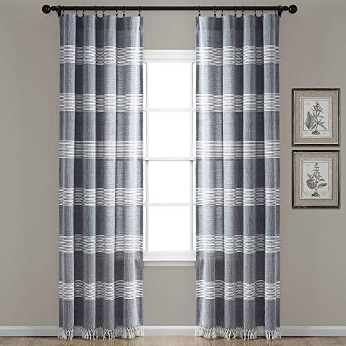 Lush Decor ネイビー タッカー ストライプ 糸染め コットン 結び目 タッセル ウィンドウカーテンパネル ペア 84インチ x 40インチ