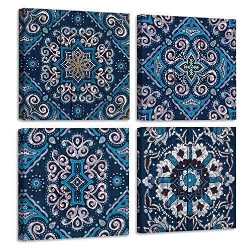 キャンバスウォールアート インディゴ ヴィンテージ 曼荼羅 花 パターン 絵画 プリント モダン絵画 4パネル フレームアートワーク バスルーム 寝室 リビング