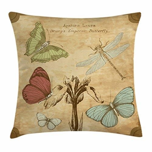 Ambesonne トンボ スローピロークッションカバー レトロスタイル 蝶 花びら グランジ効果 アートワーク 装飾的 正方形 アクセント 枕カバー サンドブ