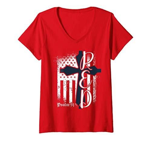 Womens Red Friday Christian Cross Bible Verse Psalm 91 V-Neck T-Shirt