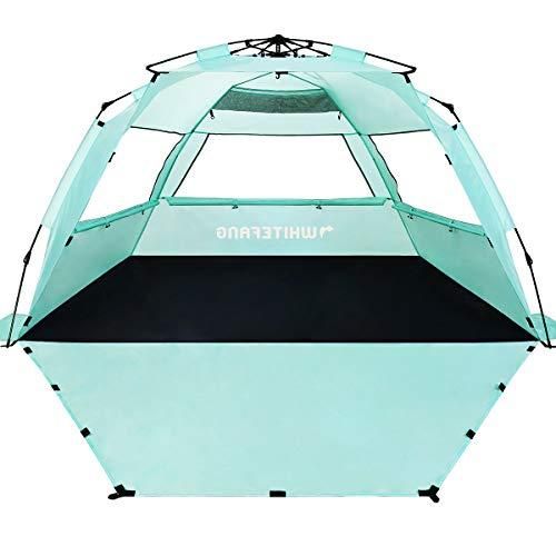 WhiteFang デラックスXL ポップアップビーチテント サンシェードシェルター 34人用 紫外線保護 拡張可能な床 換気窓3つ キャリーバッグ、杭、ガイラ