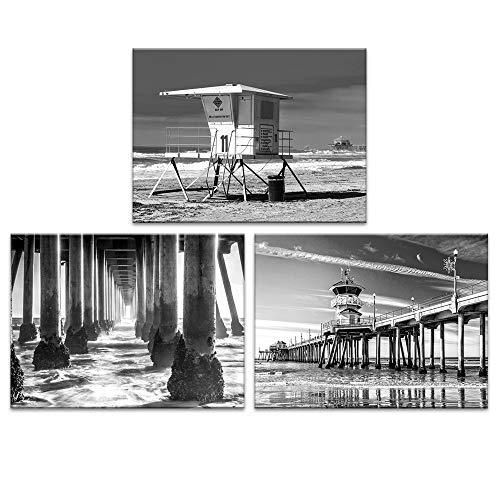 Nachic Wall 3ピース 白黒 ビーチピクチャー カリフォルニア ハンティントン ビーチ 桟橋 風景 キャンバス ウォールアート 海景画 バスルーム 寝
