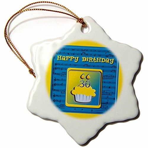 3drose Orn _ 98905?_ 1?30th誕生日カップケーキon音楽ノート、ブルーとyellow-snowflake、オーナメント、磁器3-inch