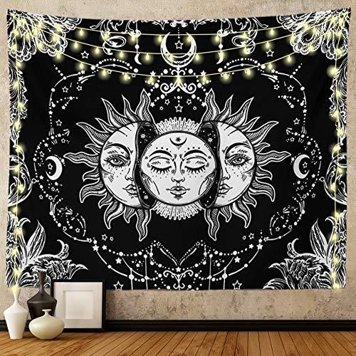 Ftuency 太陽と月のタペストリー ブラック&ホワイトタペストリー 神秘的な燃える太陽と星 壁掛け装飾 寝室用 幅59インチ x 長さ51インチ