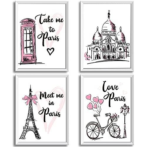 4 Pieces Paris Wall Art Prints Pink Eiffel Tower Telephone Booth Romantic Paris