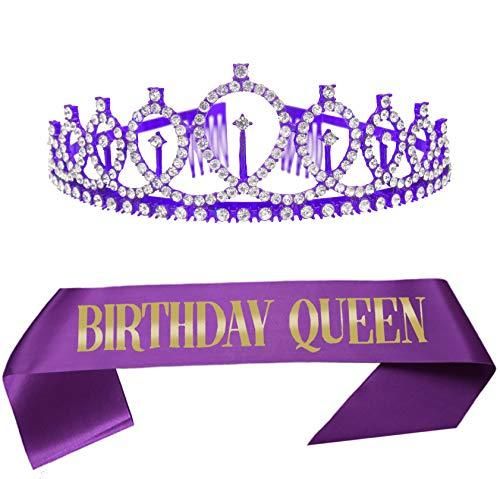 誕生日クイーン パープルクリスタルティアラとサッシュ ハッピーバースデーパーティー用品 キラキラサテンサッシュ クリスタルクラウン 20歳 21歳 30歳 35