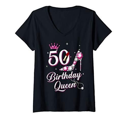 Womens 50 Birthday Queen Funny 50th Birthday Gift V-Neck T-Shirt