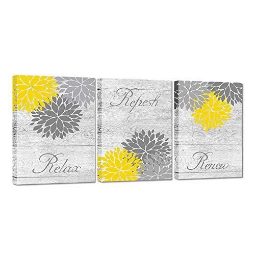 ZingArts 3ピース イエローグレー バスルームウォールアートプリント ダリアフラワー リラックスリフレッシュリフレッシュサイン 素朴な木の背景 伸ばして