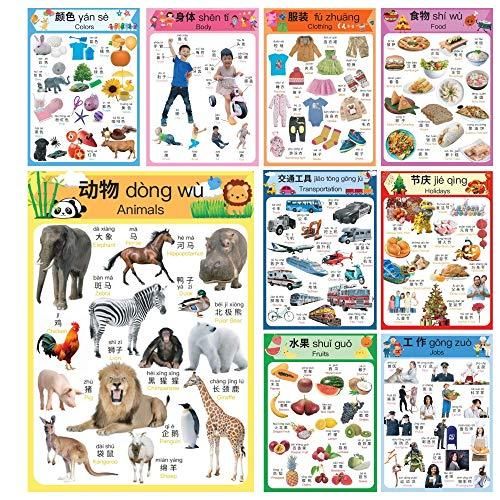 子供用中国語 モンテッソーリ風 教育ポスター 10枚 英語とピンイン付き 録音 赤ちゃん、幼児、未就学児向け 16 x 11インチ