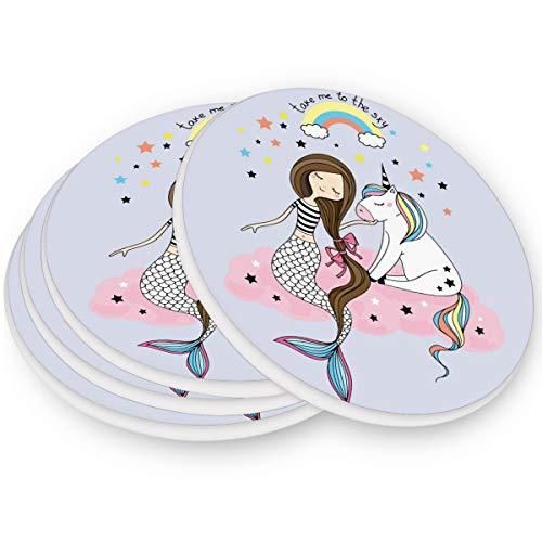 visesunny リトルユニコーンとマーメイド ドリンクコースター 水分吸収 石コースター コルクベース付き テーブルの保護 家具の損傷を防止 one siz