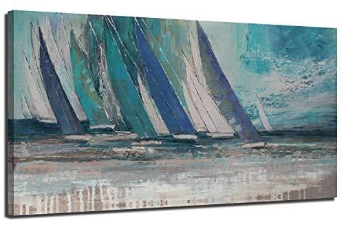 キャンバスウォールアート 抽象 青い海 ヨットの絵 モダンコースタル絵画 大型プリント フレーム入り 60インチx30インチ 1パネルアートワーク リビングルー