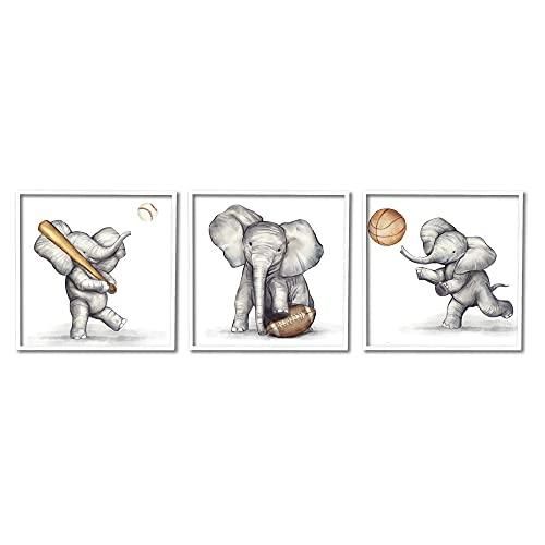 Stupell Industries ベビーエレファント アスリート バスケットボール 野球 フットボール Ziwei Li によるデザイン ホワイト フレーム