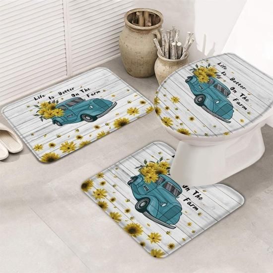 3 Pieces?Bathroom?Rugs?and?Mats?Sets Country Truck with Farm Sunflowers and Bee