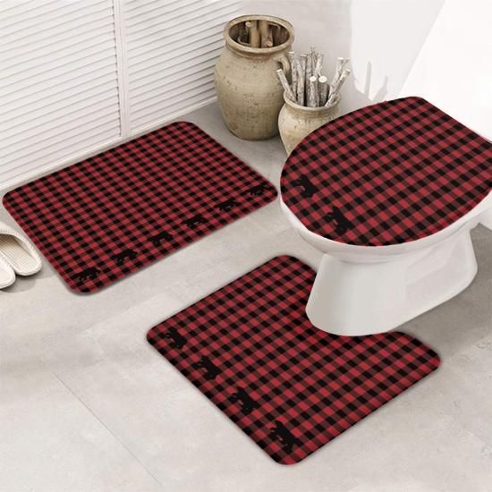 3 Piece Bath Rugs Sets Large Christmas Bear Red Black Buffalo Check Plaid Non Sl