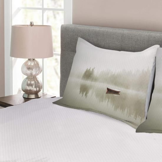 Ambesonne 風景ベッドスプレッド 湖の上のボート 水空の木のシルエット 自然アート 装飾キルト 枕カバー2枚付き キングサイズ エッグシェルブラウン