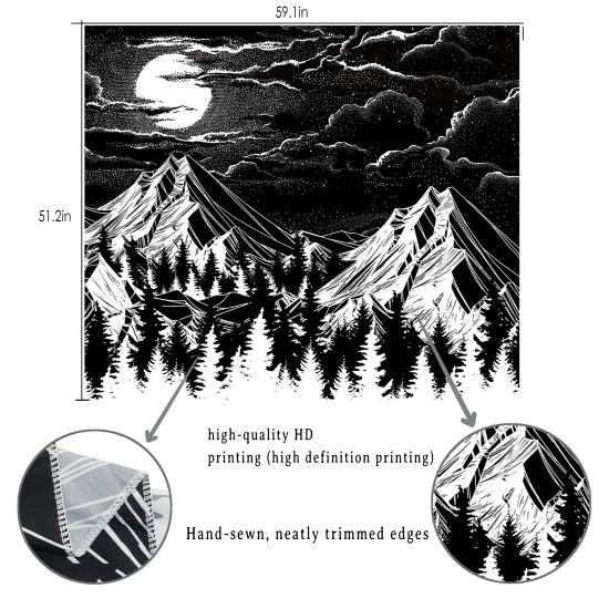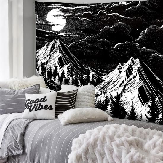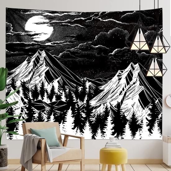 KamaLove Mountain Tapestry Black and White Moon and Clouds Psychedelic Wall Tape