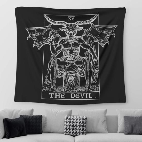 The Devil タロットカードタペストリー ブラック&ホワイト - バフォメット - ゴシックサタニック 魔女 ハロウィン ホームインテリア 壁掛け 59