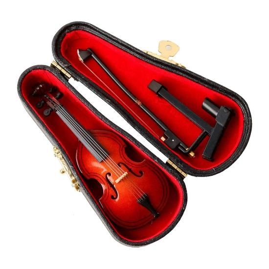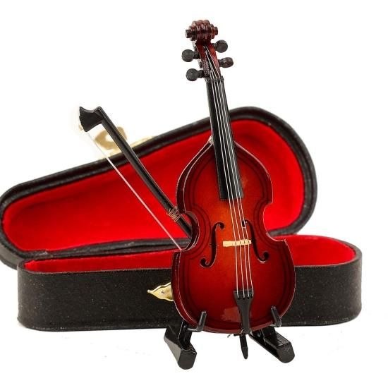 Dselvgvu 木製ミニチュアダブルバス スタンド付き リボンとケースミニコントラバス レプリカ ミニ楽器 収集価値のあるミニチュアドールハウス モデル ホー