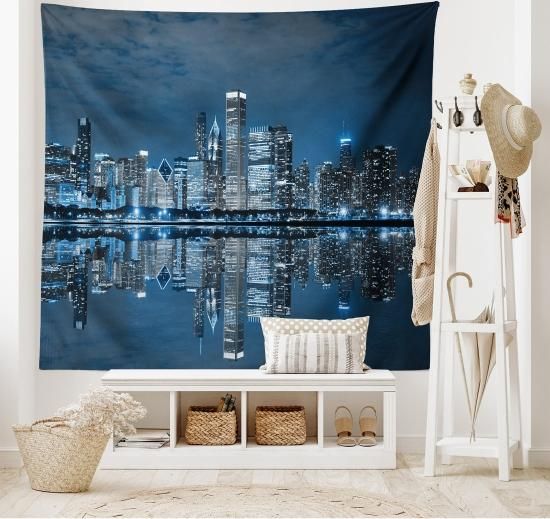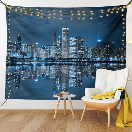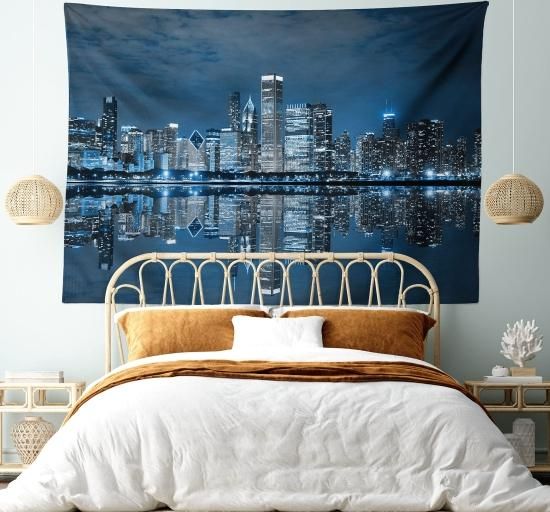 シカゴスカイラインタペストリーby Ambesonne、Sleeping City Dramatic Urban Resting人気American湖、壁吊り下