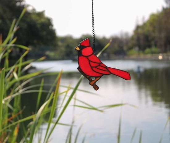 HAOSUM 枝の上の赤いカーディナルの鳥 ステンドグラス 窓に吊るす 赤いカーディナル メモリアルギフト おばあちゃん お母さん 赤い鳥 サンキャッチャー オ