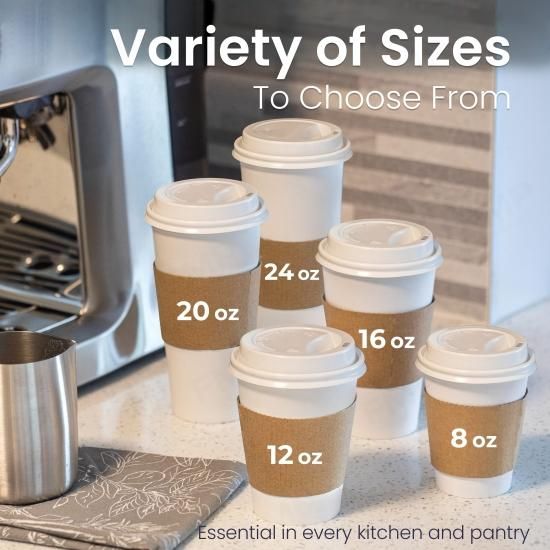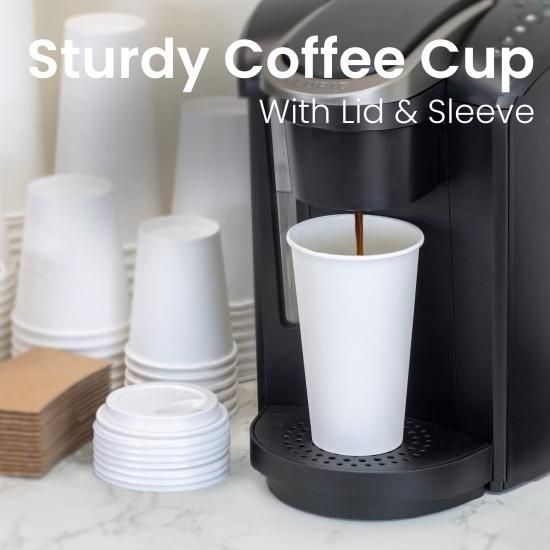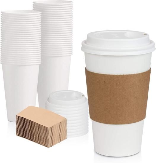 50 Pack White Coffee Cups with White Dome Lids and Brown Sleeves - 16oz Disposab