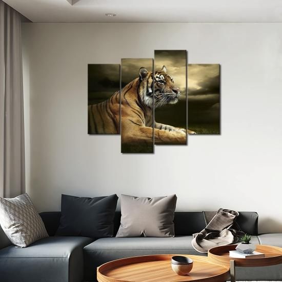 4 Panel Wall Art Tiger Looking and Sitting Under Dramatic Sky with Clouds Painti