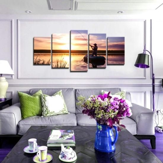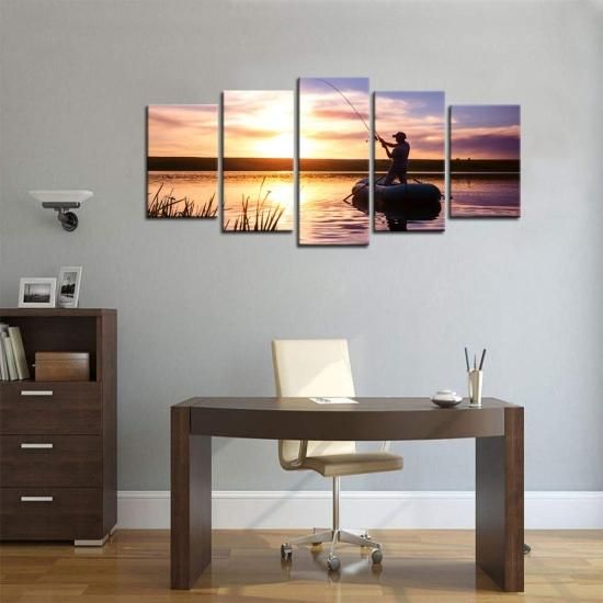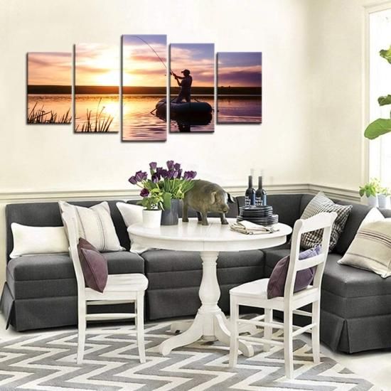 Biuteawal 5パネル ウォールアート メンズ 釣り 絵画 アートワーク 平和 湖 風景 キャンバスプリント 日没 自然写真 ホーム リビングルーム バス