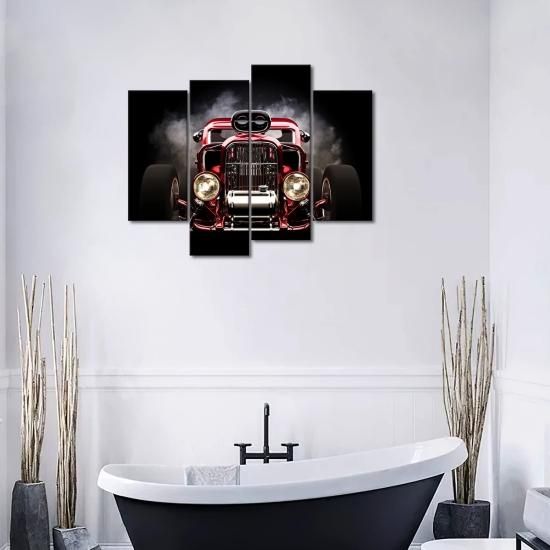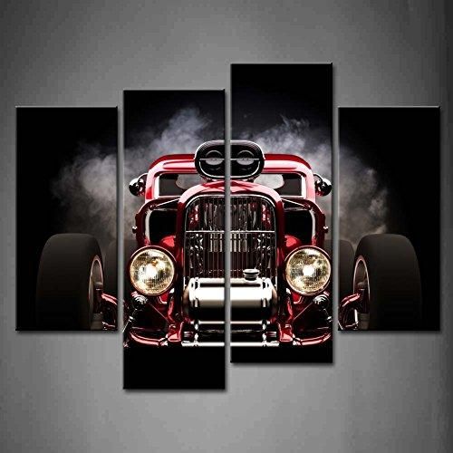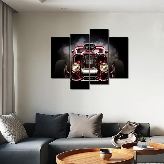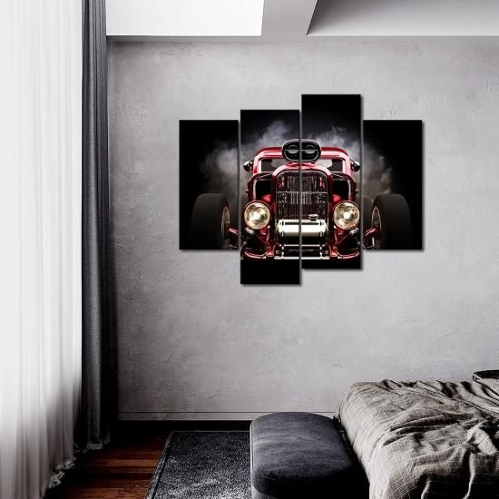 4パネル ウォールアート ホットロッド スモークの背景 ブラックペインティング キャンバスに絵プリント 車 写真 ホームデコレーション ギフトピース