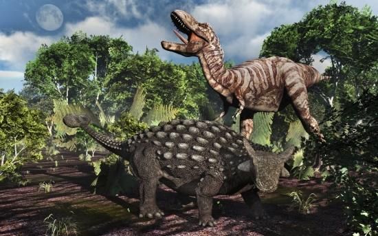 武装したアンキロサウルスがティラノサウルスから守る レックスポスタープリント Mark StevensonStocktrekイメージ 18 x 11