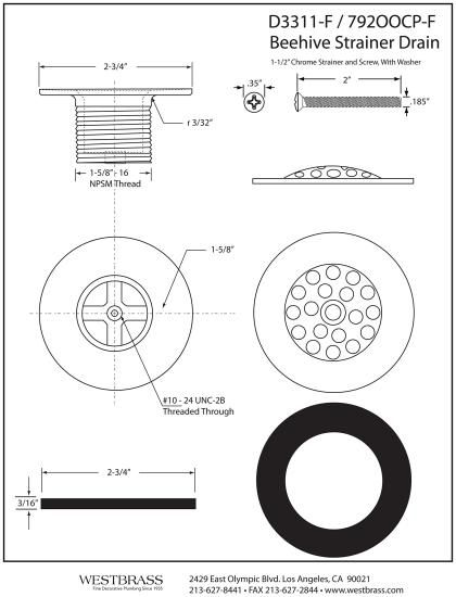 Westbrass 1-3/8インチ バスドレイン グリッドとネジ付き ステンレススチール D3311-F-20