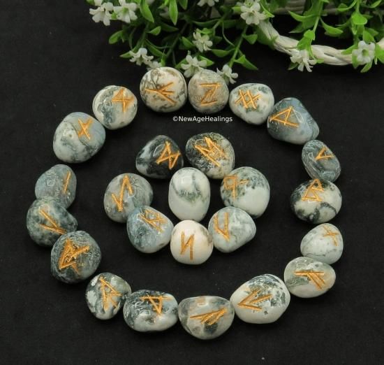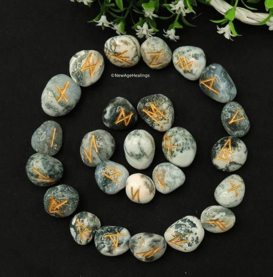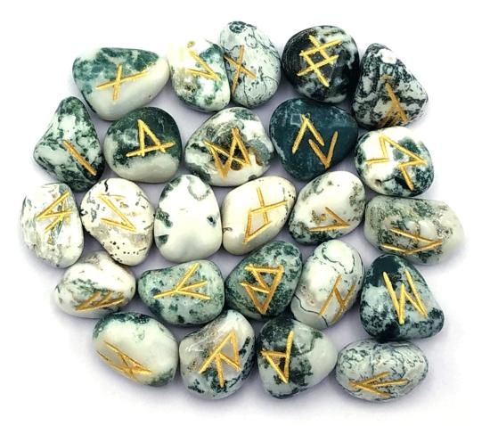 Tree Agate Runes Crystal Runes Set of 25 Engraved Rune Stones with Runes Book PD