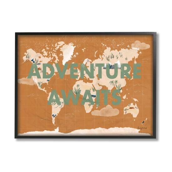 Stupell Industries 熱帯世界地図 アドベンチャー Awaits Sentiments、 Becky Thorns作 ブラックフレームウォールア