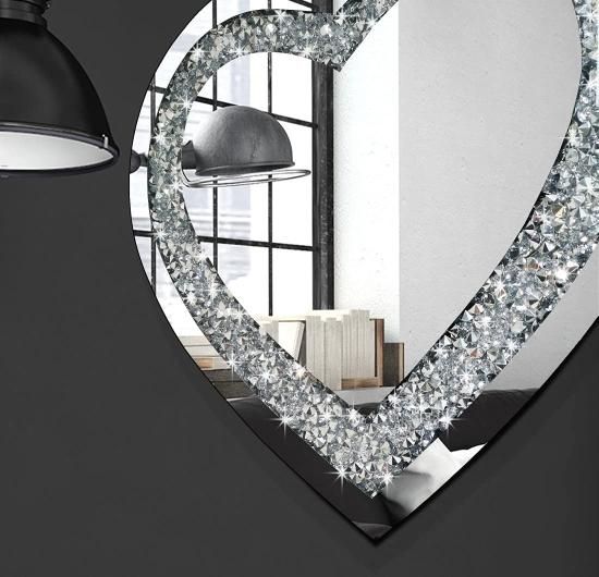 クリスタルクラッシュダイヤモンドハート型シルバーミラー 壁装飾用 24 x 24 x 1インチ 壁掛け フレームレスミラー アクリルダイヤモンド装飾