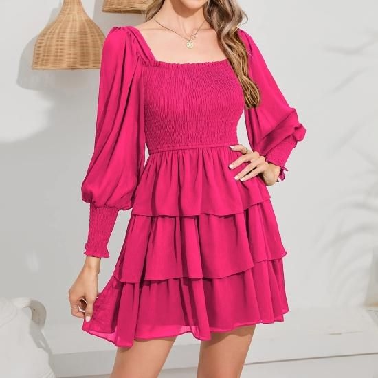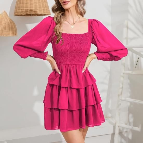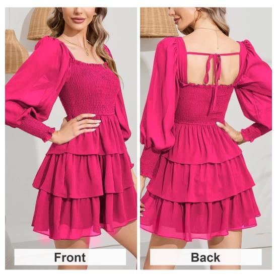 Byinns Women's Square Neck Ruffle Dress Long Sleeve Floral Print Tiered Tie Back