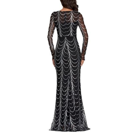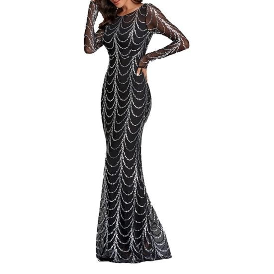 MOOSSIS Women Sequin Fishtail Dress Boat Neck Long Sleeves Maxi Bodycon One Piec