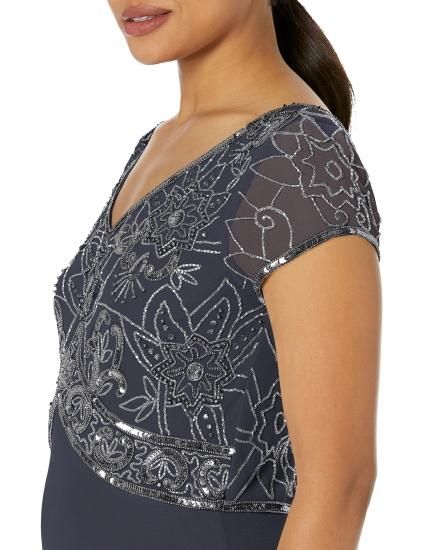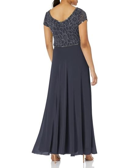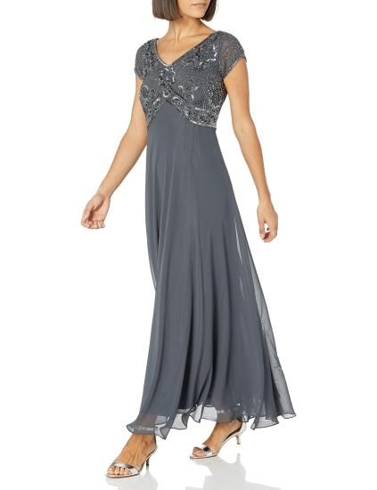 J Kara Women's Petite Cap V-Neck Beaded Dress Gray 10P