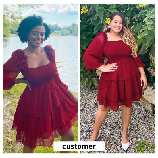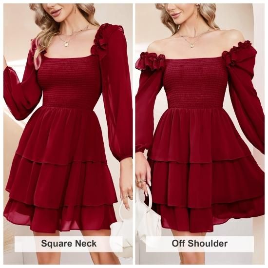 Byinns Women's Smocked Ruffle Mini Dress Square Neck Long Sleeve Party Dress Cut