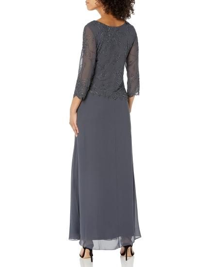 J Kara womens 3/4 Sleeve Long Beaded Floral Design Special Occasion Dress Grey/M