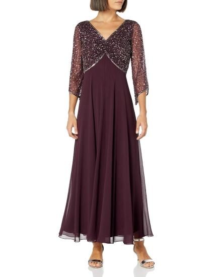 J Kara レディース プチ 3/4スリーブ Vネック ビーズ付きトップ ロングガウン US サイズ 16 Petite カラー ブラウン